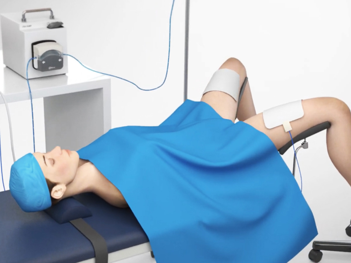 El paciente se coloca en la llamada posición de litotomía y se conecta al sistema de monitoreo de signos vitales apropiado. Dado que el sistema RFA es compatible con aplicaciones bipolares y monopolares, se deben colocar dos electrodos de dispersión en los muslos del paciente y conectarse al generador de RFA para su uso monopolar. De esta manera, la corriente se dispersa de forma segura sobre un área grande. Una vez que el paciente está preparado y cubierto, el acceso transvaginal se puede preparar en el siguiente paso.
